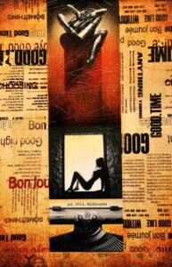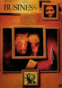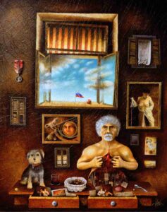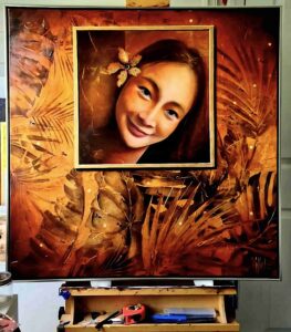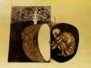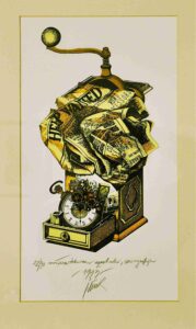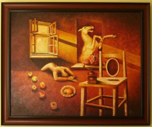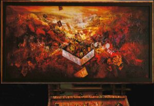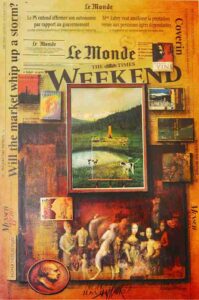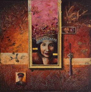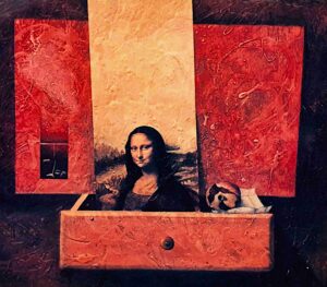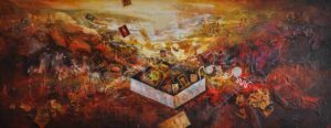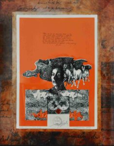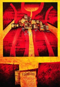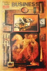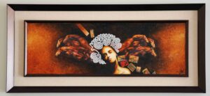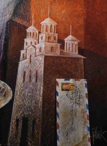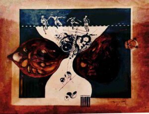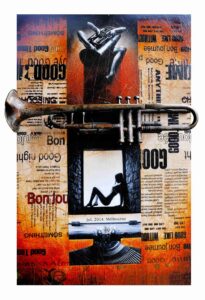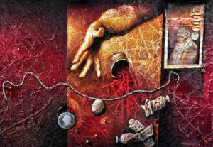 His fine art is recognized for its expressive storytelling, dynamic compositions, and confident use of color and texture. Warm earthy tones and carefully balanced forms create a sense of harmony and movement across the canvas. Many works also incorporate real-world elements such as pencils, banknotes, postage stamps, and handmade materials, blending reality with imagination in a distinctive artistic language.